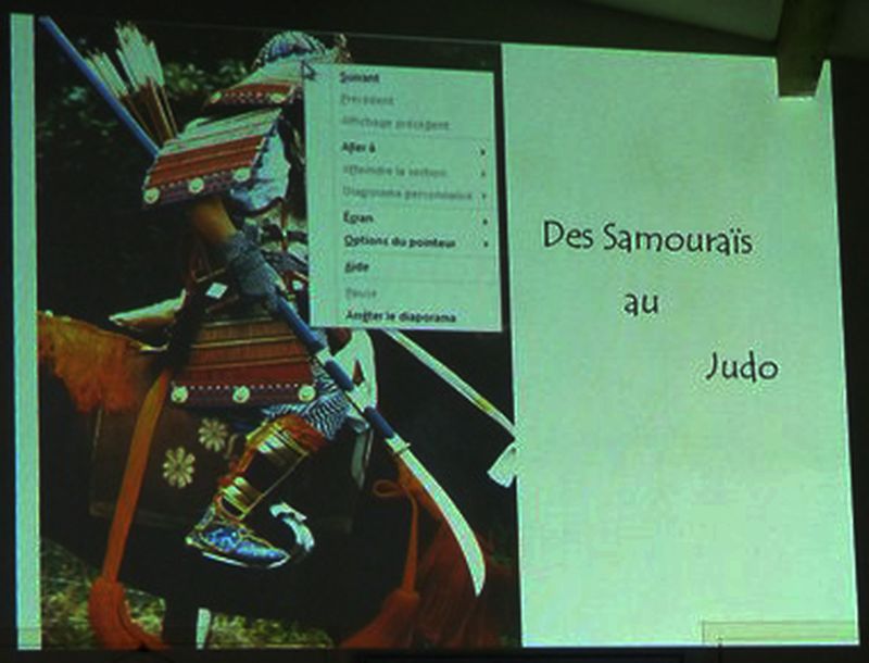Une partie historique très documentée accompagnée d’une projection de diapositives fut présenté par notre secrétaire Robert SENTENAC qui permit au public de mieux connaitre les origines et le développement à travers le monde en France, et particulièrement dans notre région, du Judo crée par Jigoro KANO à partir des pratiques guerrières des samouraïs.